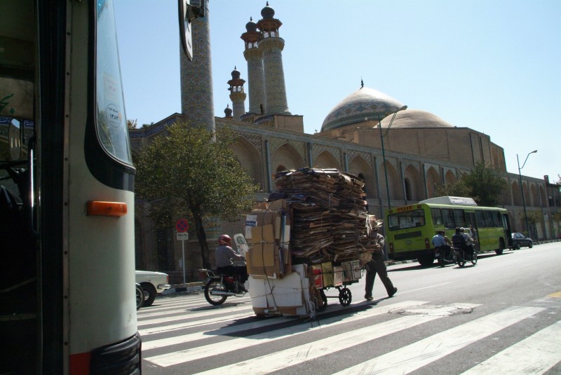 Die 15-Millionen-Einwohner Monsterstadt Teheran übertrifft wirklich alles was man sich vorstellen kann. Auch der Verkehr macht nicht viel Lust auf Radfahren, und so sind wir mit U-Bahn und Taxi unterwegs, was zwar halbwegs günstig, aber auch nicht gerade angenehm ist. Im vergangenen Jahr waren die Schulen wegen Luftverschmutzung für eine Woche geschlossen, und viele Leute klagen über Kopfschmerzen. Eine Rückzugsoase haben wir jedoch bei unserer Gastgeberin Nasi, die ein wenig außerhalb wohnt. Dort werden wir wie im Paradies versorgt, und genau so fantastisch stillt Sie auch unseren Wissensdurst über den Iran, da Sie fließend deutsch spricht und einige Jahre in Deutschland gelebt und gearbeitet hat. Auch Ihre Tochter Nakisa, die ebenfalls fließend deutsch spricht, hilft uns wunderbar weiter, und begleitet uns zur Indischen Botschaft. Leider dürfen wir dort nicht mal einen Visumsantrag stellen, da wir kein Flugticket besitzen. (In der Zwischenzeit sind jedoch Bennys Eltern so nett unsere Visa über Deutschland zu beantragen.) Außerdem begleitet Nakisa uns noch durch zahllose Buchläden, damit wir uns endlich noch einen Reiseführer für den Iran kaufen können. Nachdem wir die Hoffnung schon fast aufgegeben haben, trauen wir unseren Augen kaum, im 20. Laden dann doch ein Exemplar des "Lonely Planet" Iran in unseren Händen zu haben.