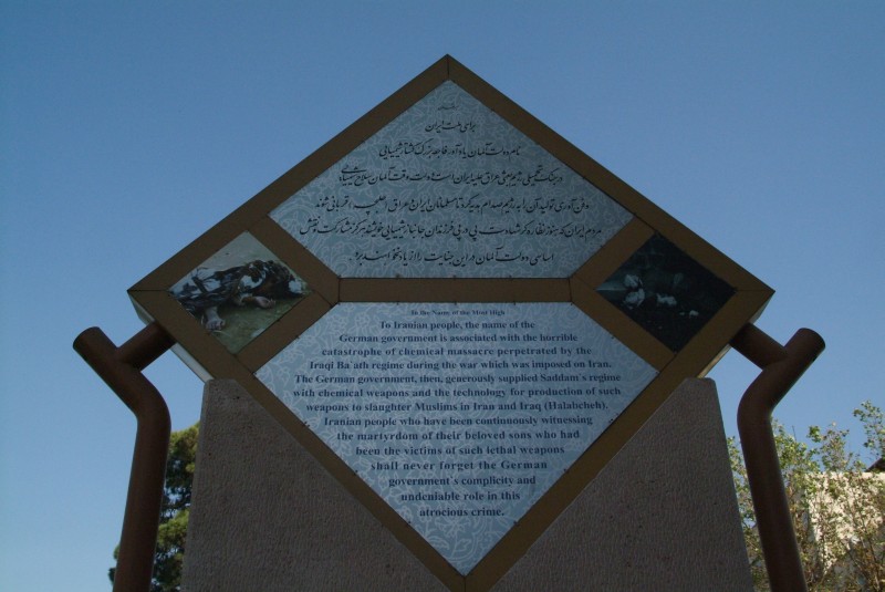 | Diese Gedenktafel bei der deutschen Botschaft kritisiert deutsche Waffenlieferungen an den Irak während des Iran-Irakkrieges |