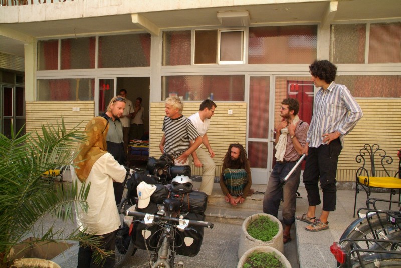 Nachdem wir uns schon über das Internet im Auge hatten, kreuzen sich in Teheran unsere Wege mit denen vom "HalloVelo" Team, bestehend aus den beiden Radlern Theo und Laura, die ebenfalls im Frühling per Rad aus der Schweiz losgefahren sind um Indien zu erreichen. Zunächst in einem Park und später zu Hause bei Nasi tauschen wir Gedanken aus und schwatzen noch bis spät in die Nacht, und entschliessen uns, 2 Tage später zusammen ab Teheran weiterzuradeln. Vorher müssen wir beiden aber zuerst noch unser Visum verlängern, und dazu gehen wir in das "Disziplinarzentrum der Islamischen Republik Iran, Abteilung Ausländerangelegenheiten". Unser Reiseführer hatte noch davor gewarnt, das Visum in Teheran zu verlängern, aber da unser Visum fast abgelaufen ist haben wir kaum eine Wahl. Sollte der Reiseführer recht behalten? Wir bekommen auf jeden Fall unseren ersten Schock, denn Mandy wird der Eintritt verweigert, da Ihr Mantel, den Sie über der Hose tragen muss, nicht lang genug ist. Und so muss Benny allein die Anträge für uns beide ausfüllen, das Geld bezahlen und alles zusammen einreichen. Doch nun erwartet uns der Zweite Schock: In 7 Tagen sollen wir wiederkommen, und so lange wollen Sie nun unsere Pässe einbehalten! Morgen wollen wir doch weiterradeln. Aber ohne Pässe?