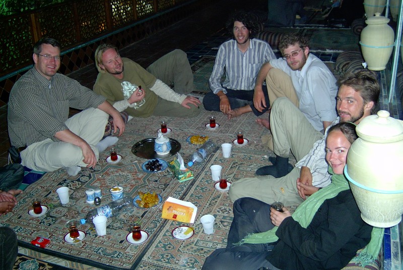 In Teheran haben wir dann noch einen schönen Nachmittag mit Nasi, bevor wir wieder mit dem Nachtzug zurück nach Esfahan fahren. Im Zug können wir zwar besser schlafen als im Bus, aber dennoch sind wir froh, dass wir demnächst wieder mit dem Fahrrad weiterreisen können. In unserer Herberge "Amir Kabil" versammeln sich wie durch Zauberhand neben den "normalen" Reisenden auch viele Radler aus der Schweiz, Frankreich und den Niederlanden, die wir zum Teil schon auf der Reise kennengelernt hatten. Zum Beispiel sind hier die beiden Reiseradler Patrick und Sophie, die von Holland nach Beijing radeln möchten, oder die beiden Franzosen Emanuel und Yohann, die schon seit über einem Jahr unterwegs sind und von Frankreich über Afrika, Amerika und Asien in den Iran gekommen sind. Auch treffen wir hier den sehr spannenden Mick aus Frankreich, der schon seit 10 Jahren unterwegs ist und nun das erste Mal zurück nach Frankreich geht. Fuer uns ist das eine tolle Moeglichkeit uns mit Gleichgesinnten auszutauschen, sei es in dem schoenen Innenhof des Hostels, in der Teestube oder auf eine Wasserpfeife im Cafe an der schoen beleuchteten Bruecke am Fluss. Es wird schnell zum Ritual, erst etwas essen zu gehen, und dann sich auf eine Wasserpfeife am Fluss zusammenzusetzen und danach gegen Mitternacht ein Eis zu essen. Auch wir merken, dass so langsam der Herbst kommt- wir koennen nur noch tagsueber barfuss gehen und Abends ziehen wir uns doch schon mal einen leichten Pullover ueber ;-)