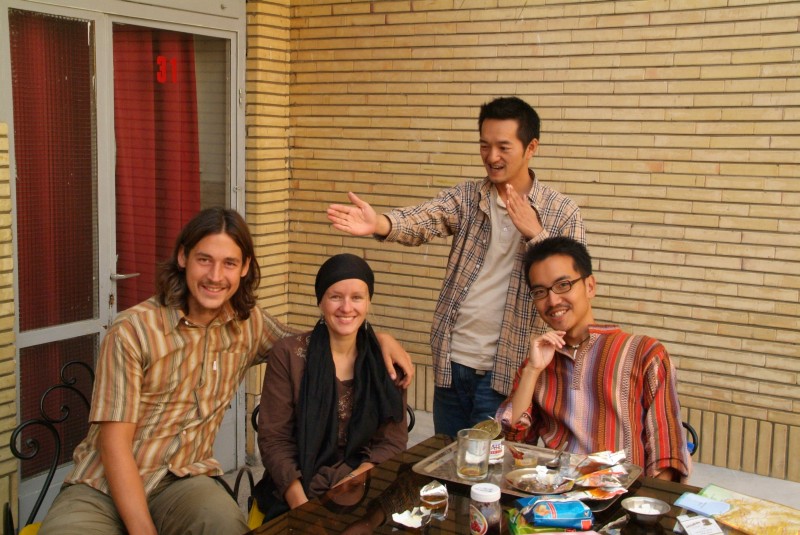 Das Silkroadhotel in Yazd hat uns mit freundlichem Personal einfach zu sehr verwöhnt. Im "Touristenhotel des Jahres" (Akhabanhotel) zelten wir auf einem schäbigem Betonhof, und das Wort das der Hotelbesitzer am besten beherrscht beginnt mit 'Mo' und endet mit 'ney'. Die einzigen Lichtblicke sind die uns bereits bekannten Reiseradler Theo, Laura, Patrick und Sophie, zu denen sich noch das nette Pärchen Ela und Marco gesellt, die mit 'Erbsli', ihrem erbsgrünen, fantastisch ausgestattetem VW-Bus Richtung Osten unterwegs sind. Wir kommen aus dem Staunen nicht mehr heraus, was die beiden alles dabeihaben und bedauern ein paar Sekunden, nicht mehr Platz auf dem Tandem zu haben. Wir haben noch einen schönen Abend, und zusammenn mit den anderen und dem gelernten Koch Patrick machen wir wunderbar schmackhafte Pfannkuchen.