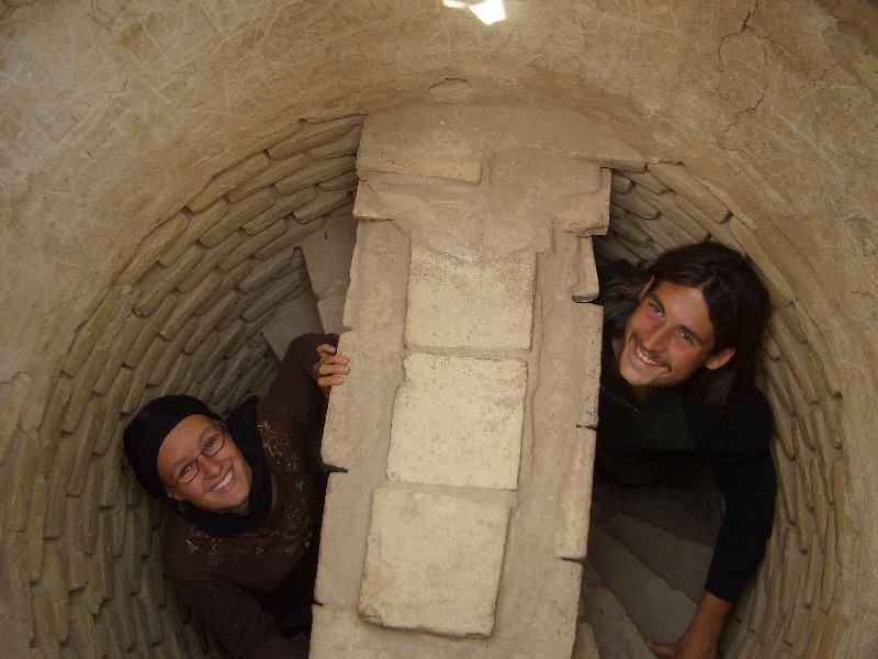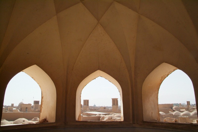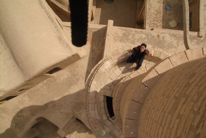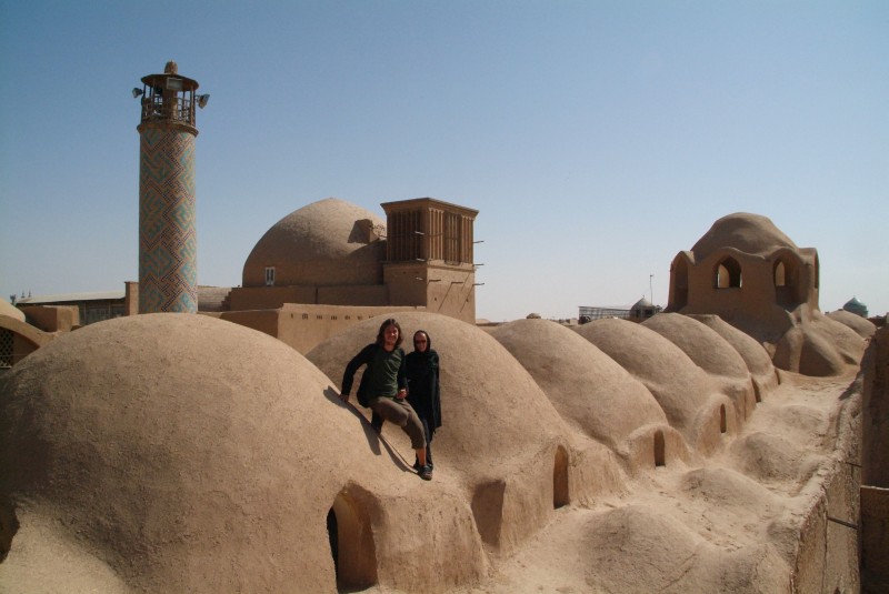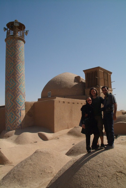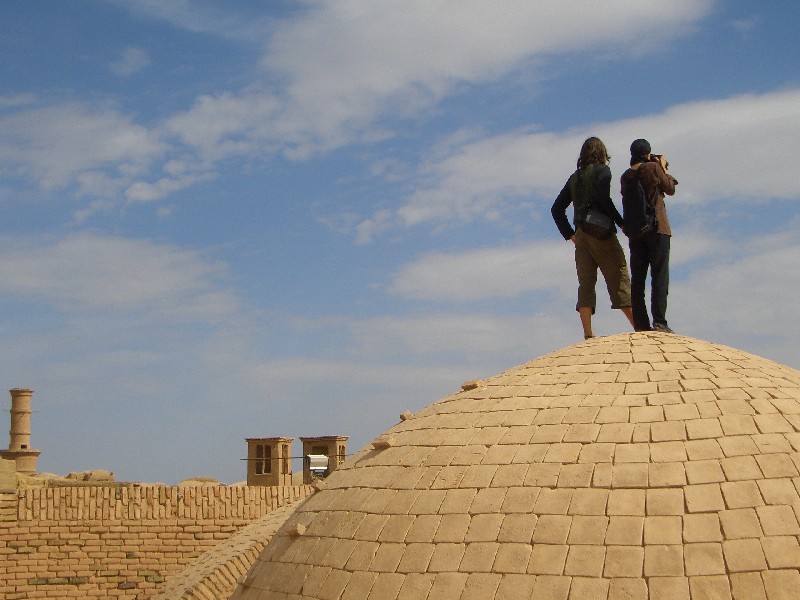 Yazd gehört mit Sicherheit zu den Städten, die leise aber heimlich unser Herz erobert haben. Auch hier sehen wir wieder architektonische Meisterleistungen, aber auch die kleinen verwinkelten Gassen, die labyrinthartig die aus Lehm erbauten Häuser verschachteln, gefallen uns auf Anhieb. Für uns ist Yazd ein schwarzes Loch, da wir hier fast mehr noch als in Esfahan zur Ruhe kommen und sprichwörtlich versacken. 'Schuld' daran ist mit Sicherheit auch das wunderschöne Silkroadhotel, mit seiner lauschigen Atmosphäre, dem leckeren vegetarischen Essen, dem guten aber billigen Schlafplatz auf dem Dach und vor allen Dingen mit den supernetten Besitzern und Angestellten dort! Das Silkroadhotel ist genau wie das Amir Kabil in Esfahan wieder der Travellertreffpunkt und so hocken wir auch hier wieder bis spät in die Nacht bei Tee oder Wasserpfeife zusammen. Grosses Glück haben wir, als wir einen Fotographen aus Kerman, Iran kennenlernen, der uns einen Abend und den nächsten Morgen schöne versteckte Ecken der Stadt zeigt und uns zum Beispiel mit auf die Dächer des Basars nimmt. Ausserdem machen wir noch einen schoenen Ausflug mit dem Südkoreaner Doyan und dem Japaner Sato in die verlassene Lehmstadt Charanag, und erklimmen dort das schaukelnde Minarett, bevor wir im Anschluss noch Chak Chak, eine heilige Stätte der Zarathustrianer (die Religion der Iraner, bevor der Islam Einzug hielt) besuchen.