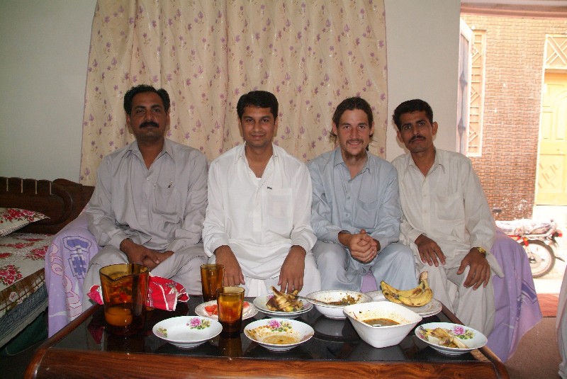 Die erste Nacht hinter Multan zelten wir auf dem Innenhof einer Polizeistation, wo mehrere arme Gestalten eingezwängt in einer Zelle hocken, eingesperrt weil sie Karten um Geld gespielt oder Wein getrunken haben- in einem islamischen Land herrscht Zucht und Ordnung! Während wir unser Essen kochen, bekommen wir immer wieder Besuch von Männern, die fragen ob mit uns alles o.k. ist, bis der grantige Polizeichef die Männer anbrüllt. Am nächsten Tag bekommen wir Begleitung von zwei Motorradfahrern, von denen der eine auch am Vorabend verjagt wurde und der den Tag frei bekommen hat, damit er uns begleiten kann! Wir werden unzählige Male zum Tee eingeladen, und spontan organisiert er, dass sein bester Freund uns in sein Haus zum Mittagessen einlädt. Erst nach Sonnenuntergang finden wir an diesem Abend eine Übernachtung- diesmal ist es ziemlich schmucke Station der Verkehrspolizei. Wir werden herzlich aufgenommen von der wirklich netten Gemeinschaft dort, bekommen ein Zimmer und sogar zu Essen, und der Kommandeur weist seine Polizisten bei der Wachablösung darauf hin, dass wir den Status von Bruder und Schwester haben, was für uns eine grosse Ehre ist.