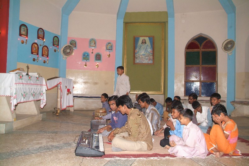 Am darauffolgenden Tag machen wir an einigen Obst- und Getränkeständen halt und werden wie immer von vielen neugierigen Augenpaaren gemustert, auf die wir wie Ausserirdische wirken müssen, denn wann hält schon mal ein Ausländer per Fahrrad in diesem kleinen Dorf? Während wir im Stehen unsere Fanta trinken, kommt plötzlich ein sehr alter Mann mit Turban, stellt uns ein paar Kästen zum Draufsetzen hin, schenkt uns Früchte von seinem Stand und setzt sich in seiner stillen Art und Weise ohne ein Wort zu sagen einfach neben uns und strahlt eine enorme Ruhe aus. Abends wieder auf der Suche nach einem Schlafplatz sehen wir plötzlich eine Kirche, aus der Gesang und Trommeln erklingen. Neugierig treten wir ein. Wie sich heraustellt, singen dort blinde Kinder zusammen mit Sozialarbeitern. Der sehr engagierte Francis Lawrence lädt uns spontan ein, im katholischen Blindenheim zu übernachten, das für blinde Christen als Anlaufpunkt dient. So können wir noch einer Messe beiwohnen, in der uns die Kinder stolz ihre Lieder vorsingen. Ausserdem erfahren wir, dass auch sie das Lieblingsspiel aller pakistanischen Kinder spielen: Cricket! Sie haben dafür spezielle Regeln und einen Ball, der in Bewegung ein Geräusch ertönen lässt.